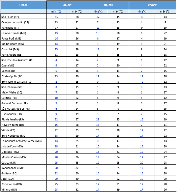 Confira as menores temperaturas já registradas, para o mês de novembro, nos estados da Região Sul, além de São Paulo, Mato Grosso do Sul, Mato Grosso e Goiás: