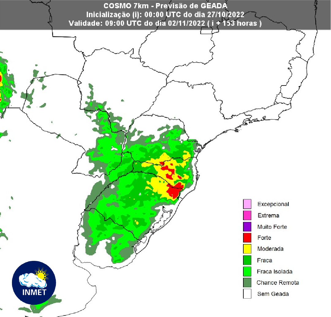 Essa intensa e atípica massa de ar frio deve atuar no Brasil até o fim da semana, com possibilidade de temperaturas negativas e geada até quinta-feira (3), principalmente, nas áreas mais altas da Região Sul. A figura 3 apresenta uma tendência de formação de geada ao amanhecer da quarta-feira (02) indicando, por enquanto, chance de geada forte em áreas das Serras Gaúcha e Catarinense.